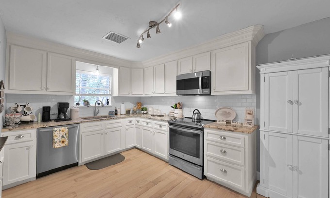 Indulge in tranquility at our 3-bedroom, 2-bath retreat near Lake Livingston. Nestled in nature, this quiet haven offers more than just a getaway. Inside, a spacious living area invites relaxation, complemented by a fully equipped kitchen. With three cozy bedrooms, it's perfect for families or friends. Explore the collection of games and books for added entertainment. Step outside to a private patio with a fire table, perfect for cozy evenings beneath the stars. The surrounding trees provide a natural backdrop, enhancing the serenity.