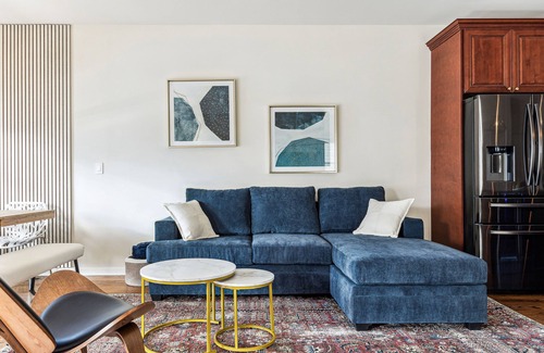 The open plan kitchen allows for entertaining while cooking with new cookware, utensils and appliances. Use the wine fridge to chill your best bottles before dinner. The connected living room provides access to the dining area, a large dining room table, and an outdoor balcony.