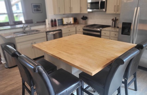 The home is very comfortable year-round with a forced-air gas furnace for heating and central air conditioning for cooling. It also has a completely updated and modern kitchen with all appliances, including a dishwasher and a large kitchen island with bar stools. Note that one of the second floor bathrooms has also been enhanced with a jetted bathtub for guest enjoyment!