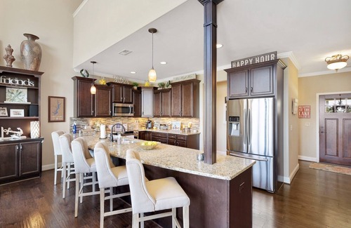 The gourmet kitchen is very well stocked and large, with plenty of room for multiple cooks. Custom cabinets, granite counters, stainless appliances, and a large refrigerator will help you to feel right at home. There is a large dining table with seating for 8, with additional seating for 5 at the oversized bar area.