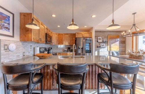 The condo boasts breathtaking views of the surrounding mountains, which you can enjoy from the private outdoor deck with seating. Inside, you'll find a spacious and thoughtfully designed interior with an abundance of windows to take in the views and natural light. There are two bedrooms, each featuring queen beds, as well as a sofa bed in the living room. Three full bathrooms means that everyone can get ready in the mornings! The bedroom baths are both en-suite and there is even a separate office with a dedicated workspace along with a TV and sofa for those needing to get away and do a little work while on vacation. The gourmet kitchen with bar seating makes whipping up a meal a breeze and the dining table also takes in the fabulous views for those memorable dinners. Additional amenities include heated underground parking, a ski room to store your gear, and a free shuttle that stops right outside, making it easy to explore the area.