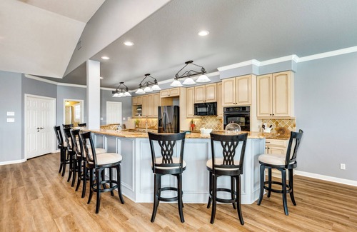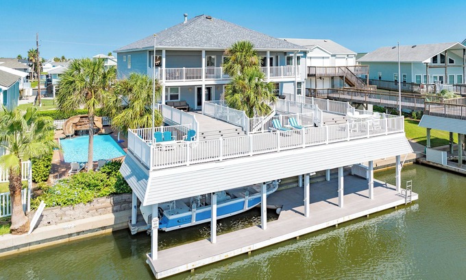 Welcome to West Bay Hideaway, a luxurious Galveston vacation rental with stunning water views, ideal for large families or groups seeking the ultimate island getaway. This expansive 6-bedroom, 3 full & 2 half-bathroom home offers everything you need for a memorable vacation, including a private pool with a water slide and waterfall, an elevator, and two spacious living areas.