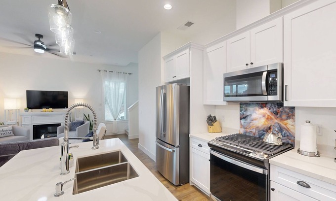 This townhouse boasts high-speed WiFi, a Roku for streaming your favorite shows, plush bedding for a restful night's sleep, and a fully stocked kitchen for all your culinary needs. Step outside to the patio space with a BBQ grill, perfect for enjoying al fresco dining. Relax in front of the electric fireplace after a day of exploring.