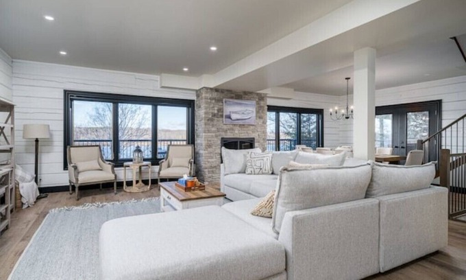 The main level features large windows overlooking the lake with an open concept kitchen with stainless steel appliances, quartz countertops and an island. The dining area can accommodate 12 people around the large harvest table overlooking the lake. Enjoy lounging in the living room with friends and a movie on the 65' t.v or cuddled in front of the fireplace with a good book. A tranquil space awaits you in the seasonal screened Muskoka Room offering views of the lake.
