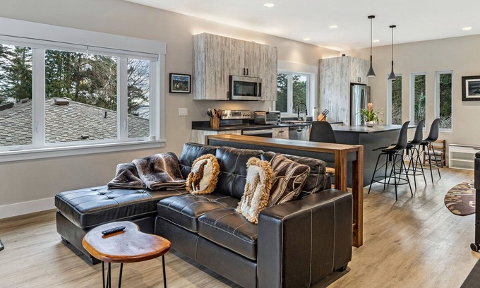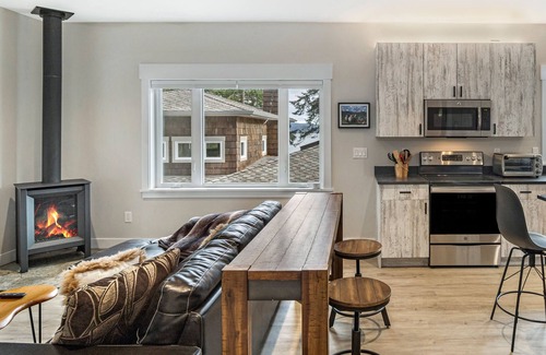 The newly built loft has a gourmet kitchen with all the cooking necessities, a spacious island with bar seating for 4 and a full-size refrigerator. Also enjoy the cozy balcony to BBQ your favorite foods. The open concept provides room to move from the kitchen to the living space which boasts a 55” Smart TV, mini-split heat/cool system, propane fireplace, and a sectional sofa.