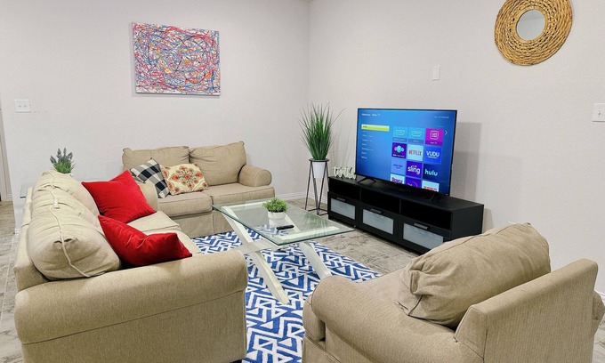 Forget your worries in this spacious and serene space. This home features 4 bedrooms 2 bathrooms, fully furnished with modern decor and well-equipped kitchen, perfectly designed for family, friends, remote workers alike.