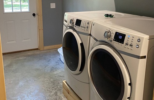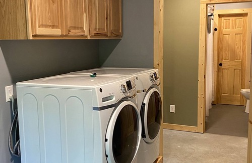 Cabin in the woods is an 1800sq ft cabin style home. This cabin will comfortably sleep eight with 2 private bedrooms on the first floor and a spacious loft with a queen bed and a queen futon. The cabin has a full bathroom, a full kitchen, an island with bar style seating, and a spacious living room. There is a microwave, toaster, coffee pot and Keurig along with a stove/oven combo, and a frig with an ice maker, and a washer and dryer. All the dishes, towels and lines will be provided for you. On the front patio of the cabin there is a charcoal grill for your use along with a fire pit for you and your guest to enjoy.