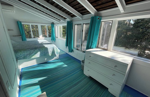 Upstairs, the roomy master bedroom, second bedroom and lovely porch bedroom all have have comfortable mattresses. The middle bedroom has two single beds, perfect for kids. The downstairs bedroom also has a single bed.