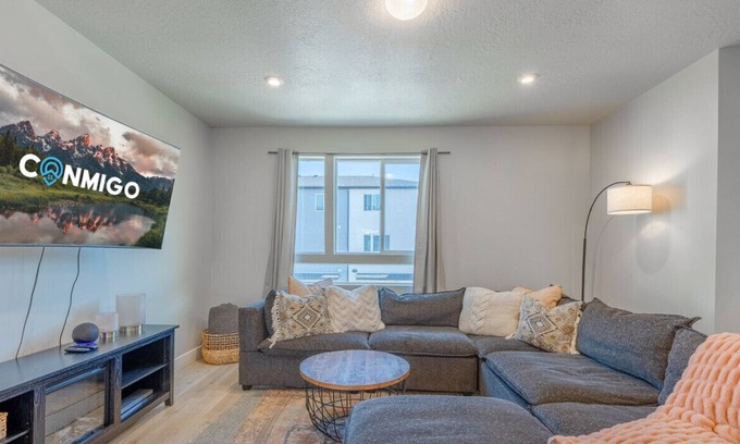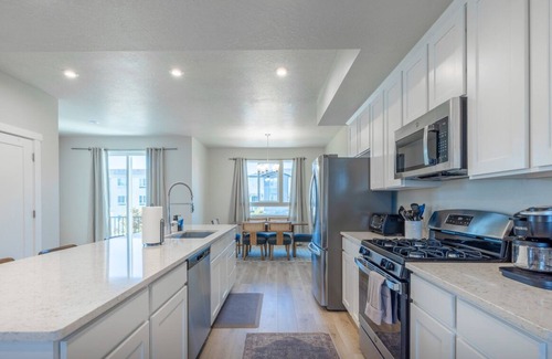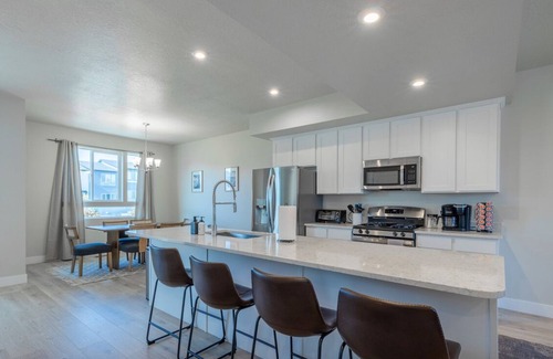 A contemporary 3-bed, 2.5-bath retreat in American Fork, designed for comfort and relaxation. This newly built home accommodates up to 8 guests, offering a blend of sophisticated design and cozy charm. Whether exploring nearby attractions or enjoying the outdoor community pool and pickleball court (seasonal), Theo provides the perfect home base for your Utah getaway.