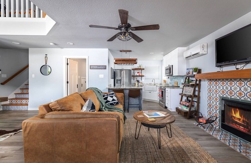 The space includes 1 queen bed (with an incredible adjustable frame), 1 full bed, a comfy sofa, 1 queen air bed, 2 full bathrooms, a full kitchen with cooking supplies and stainless steel appliances, complimentary coffee + tea, dining area, indoor fireplace, 2 covered porches (perfect for deer watching) and plenty of outdoor space to unwind and connect with nature.