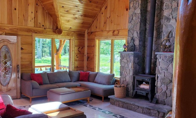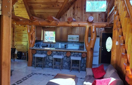 Enjoy the sounds of nature, and seclusion when you stay in this unique hand crafted cozy log home sitting on a private 8 acre property surrounded by woods. It features a large pond with thousands of koi fish and is a 5 minute drive from Swinging Bridge lake.