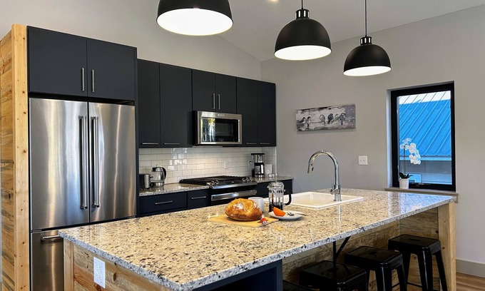 Fully equipped kitchen with stainless appliances and granite countertops, air frier and slow cooker
