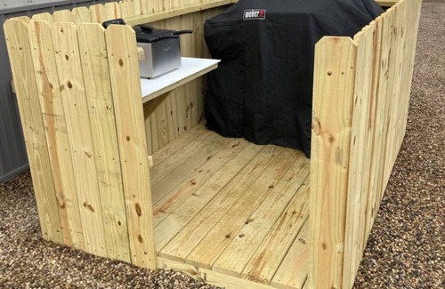 The space includes microwave, air fryer, refrigerator, coffee maker, pizza oven, stainless steel sink, table and chairs, two (2) reclining love seats, and tv. Sleeping area has four (4 single beds) with a 3/4 bathroom with a 4’ shower.