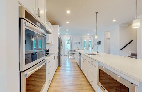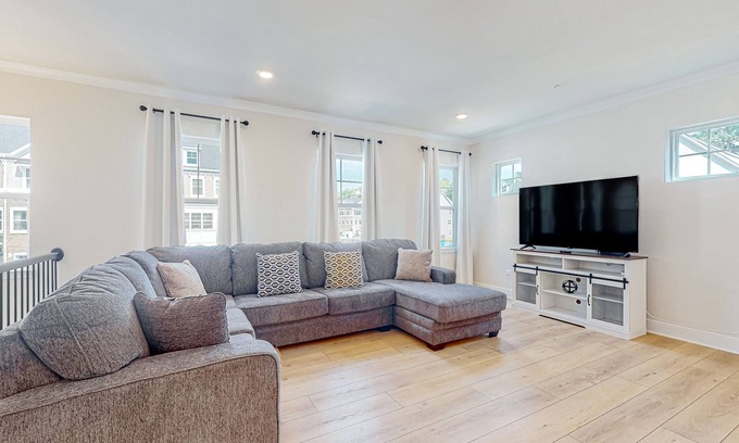 Serving as the home's central gathering place, the second floor features a spacious, open-concept design blending the kitchen, living, and dining areas. A plush sectional and smart TV set the stage for family movie nights. The impressive full kitchen boasts a deluxe suite of stainless steel appliances and plenty of counter space you'll need to inspire gourmet meal creations. The balcony off the dining area is an ideal spot for morning coffee.