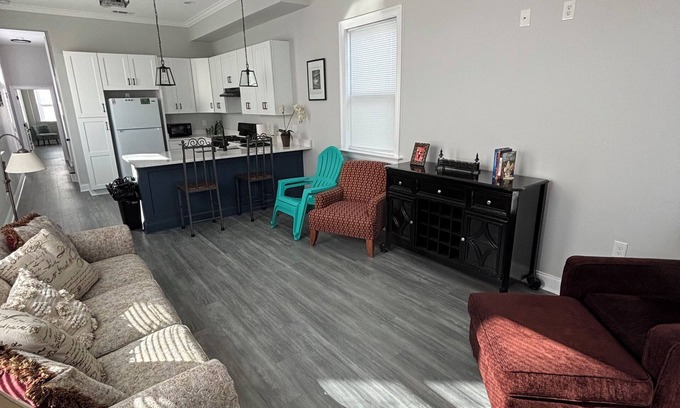Forget your worries in this spacious and serene space. This newly constructed home (4br; 2.5bath), is just 10 minutes from the French Quarter, offers ample space for families. Enjoy an open-concept design, quartz countertops, and 10’ ceilings—no carpet! The master suite features a spa-like bath and walk-in closet. With off-street parking and an in-unit washer/dryer, this is the ideal spot for your NOLA stay! Feel free to reach out to us during your stay - we're happy to suggest local spots to check out.