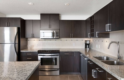 A great option for your visit to Calgary, our condo is fully furnished and equipped with all essentials for your stay. The property is located in the Encore building of the Spruce Cliff Towers looking over the Shaganappi golf course in Southwest Calgary. You will find the kitchen to be stocked for everyday use where you will be able to brew your morning coffee and comfortably make a meal for you and your fellow travellers! Visiting a new city has never been easier when you can unwind at the end of the day in a comfy living room with a stunning view, catching up on your favourite shows or reading the internet. The master suite features a King size bed and en suite bathroom. The other bedroom is a Queen size bed with the second bathroom near by.