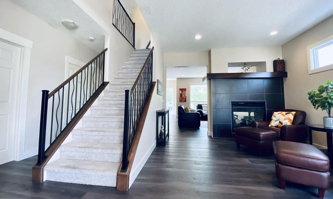 20 mins drive to downtown Calgary, ~1hr drive to Banff, 2 mins drive to Aspen Landing Shopping Centre (Safeway, starbucks, etc), and with a green path right at your doorstep, this retreat is the perfect blend of comfort, convenience, and natural beauty!