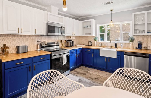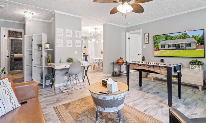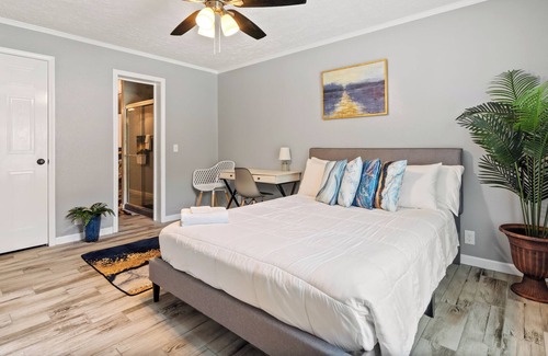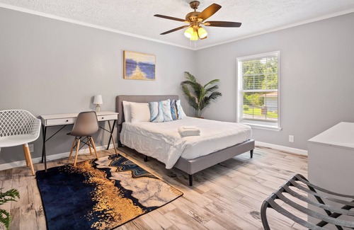 Serenity Cottage is a perfect haven for professional travelers. This quaint cottage is situated on a quiet street just outside of the hustle and bustle of Daphne and Mobile. The home offers 3 desks and high speed internet for those working remotely. Relax in the spa like showers or catch your favorite team playing on the 65 inch tv. Cook in the well appointed kitchen or order in from the plethora of restaurants that are nearby. Only 15 minutes from Downtown Mobile, 25 minutes to University Hospital, 19 Minutes to Mobile International Airport (BFM), 42 minutes to Mobile Regional Airport (MOB) and 50 minutes to Pensacola Airport (PNS). This home is available for a minimum stay of 3 nights or for longer term reservations not to exceed 6 months.