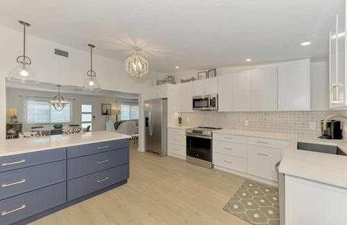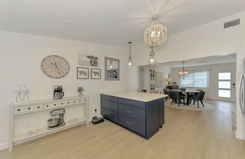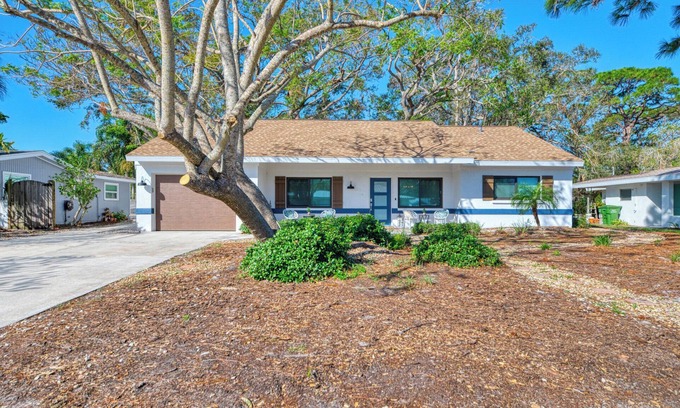 WOW!!! This home had 33 reviews and 5 stars BEFORE the remodel! REMODEL (11/24) includes plumbing throughout the home, new floors, PLUS complete kitchen and bathroom remodel. Welcome home to this unique coastal cottage...this home will delight with the touches that don't represent the typical beach abode. ...The casual yet sophisticated home has a split floor plan with gorgeous honey toned wood tile throughout...and the Primary is separated from the other two bedrooms for your peace and quiet. The Open Kitchen concept allows ease of preparing meals or snacks while entertaining and boasts New Quartz countertops. The Lanai looks over the yard which is perfect for relaxing after a full day at the beach or having a burger on the grill. There is a King bed in the Primary Retreat, which has a large closet, unique for 1950's homes, and a 50" TV. The 2nd Bedroom has a Queen bed and large double closet, and curtains that will block out light for a restful sleep. A set of Twins in the 3rd Bedroom allows for 2 persons to sleep comfortably OR can push together for a larger bed for 1. The 3rd bedroom also has a desk for your convenience and two sets of double closets. In the Living Room there is new furniture including a brand new sofa, leather club chairs, 65" Tv in the living room, High Speed Internet and Wifi all included. . LOCATION is perfect... 5 minutes to Siesta Key Bridge and 10 minutes to downtown. Want to Swim in a pool? 1/2 Block to Arlington Park which has 2 swimming pools, beautiful shaded walking paths, a playground, tennis and pickle ball courts. Vacation City of Sarasota Certificate Registration #VR24-00077