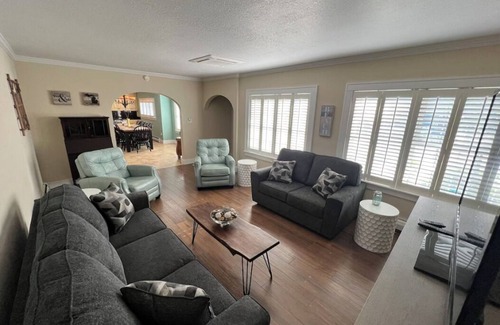Walk in the front door and to the left you'll see the beautifully remodeled living room with a large screen TV and plenty of seating. To the right is the oversized kitchen (table seats 10!) fully stocked with everything you need to prepare meals for your group (plus a gas BBQ outside). There's even a second refrigerator in the garage in case you need the extra space.