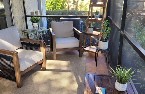 This entirely remodeled and clean, ground floor condo with free parking at your front door is 2 bedroom and 2 full bathrooms. A king size in the master and two twin beds in 2nd bedroom. Great for families and a relaxing stay with lots of amenities. Located across from a large park with play structures and walking trails. 6 min. to Indian rocks beach and the gulf coast. Close to fantastic places to dine/shop nearby! This is a peaceful, safe location and right across from a very nice pool and bar-b-que. Everything is nearby from coffee shops, grocery stores, great restaurants either on the beach or close-in for take-out. The condo is beautifully decorated and has a very fresh vibe with a outdoor screened patio and furniture. With very easy access and quiet privacy this condo is sure to be one to consider coming back to!