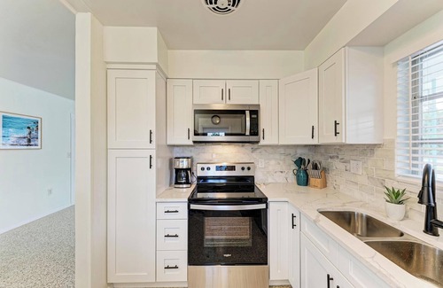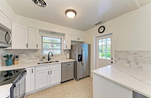 Our house has everything you need for a great vacation. Inside, you will find new furniture and a beautifully remodeled kitchen with quartz countertops and stainless steel appliances. The kitchen is fully equipped for your every need. A washer and dryer is also provided. You will find linens, towels and an initial supply of kitchen and bath supplies to get you by until your first trip to the store. The main bedroom has a king size bed with an ensuite bathroom that includes a walk-in shower. The next bedroom has a queen size bed with twin size bunk beds. In the sunroom you will also find a pull out queen size sleeper sofa with gel memory foam mattress. There is also a second bathroom that has a tub/shower combo. Both bedrooms and living room are appointed with flat screen TV's with YouTubeTV 100+ channels, and the entire home has high speed wifi.
