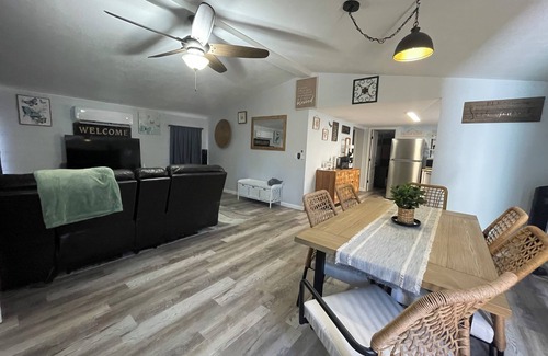 Relax with the family at our peaceful pet friendly newly remodeled home away from home. Welcoming entrance brings you into the dining & living room. Kick your feet up and relax your cares away in our reclining sectional. Fully functional kitchen and laundry room. Smart Tv in bedrooms and living room. New front and back porches with Bbq grill.