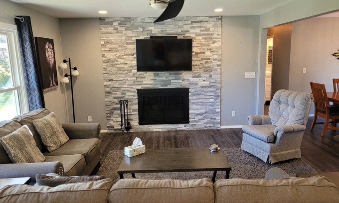 2600+ square feet of newly remodeled bi-level ranch in a beautiful and quiet neighborhood just minutes from everything you love about the Wausau area. There are 3 bedrooms on the main level with a bathroom that boasts a dual vanity sink setup and multi jet shower fixture with tub. Take a regular shower or massage your aching muscles with the body jets, or try the hand wand. There is a half bath on the other side of the house with a stool and vanity if that one is occupied. The half bath also has laundry facilities if needed for your trip, free for the using. The full kitchen and open concept living room is nicely placed between with new Samsung appliances including a refrigerator, stove, microwave, and dish washer! The living room has a Samsung Smart TV with Netflix and Hulu loaded for viewing a show and high speed wifi enabled internet to service all your devices.
