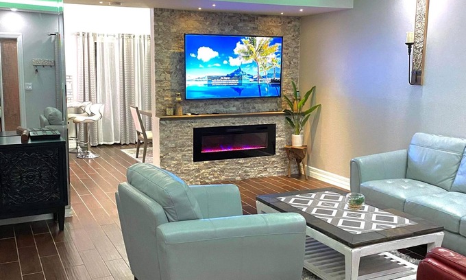 - spacious living room with the cozy glow of a beautiful built-in electric fireplace sets the mood for any occasion year-round; comfortable sofa; smart TV