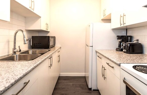 Enjoy a cozy, clean private suite with a full kitchen, bathroom, living room and 1 bedroom located on a quiet safe street in Vernon, walking distance to downtown and neighborhood amenities.