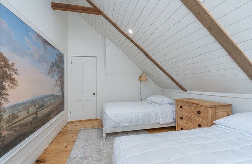 This 4 bedroom, 3 bath farm house has over 2,200 finished square feet. It was recently renovated & very well designed with high end furniture from Pottery Barn, West Elm & a few vintage pieces. We provide you with high quality white bedding linens & plush bath towels & a well stocked kitchen. There are total of 3 Samsung Framed TVs with Roku for your entertainment. On the first floor, there's a living room, dining room, kitchen, 1 bathroom & a master suite with a king bed, a reading nook, a desk & a full bath with shower & soaking tub. There is also laundry room with washer & dryer. There's a game room off the kitchen with arcade game, a multi game table & variety of board games. There is a record player with more than 50 of old records that originally came with the house. Upstairs, there are 3 additional bedrooms & a full bath: 2 bedrooms with queen bed & 1 bedroom with 2 twins bed. All flooring is original white pine plank and will creak as you walk.