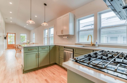 Bradley Park Bungalow is a freestanding single family cottage, in a quiet residential neighborhood. The home is bright, sunny, and clean. There are three bedrooms with a queen, king, and bunk bed (full, twin and twin-sized trundle). The living room has plenty of seating with a u-shaped couch and a large smart tv. Everything is newly renovated, including a fully-stocked kitchen and full bathroom. The outside includes a front porch with rocking chairs, newly landscaped backyard with Adirondack chairs, and a patio with a table and chairs.