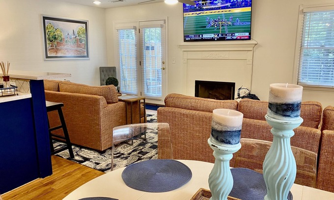 Parking is a breeze with a GARAGE and private driveway! “Caddy’s Shack” of course allows dogs to visit and has a huge fenced backyard with a party deck & grill. Linens, towels, basic soaps and shampoo are provided, along with WiFi and a large screen smart tv.Every room has a ceiling fan and all floors are LVP. Updated pictures will be posted as the reno gets underway. We’d love to host you! War Eagle!