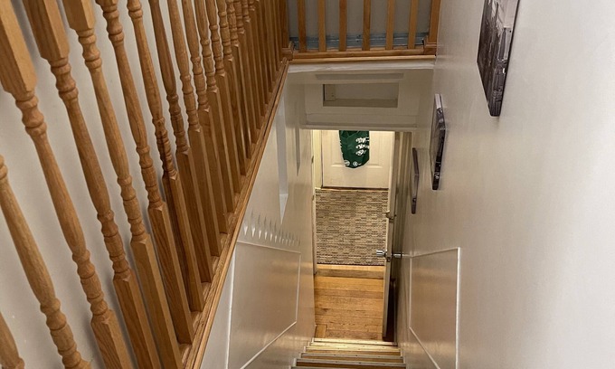 This’s a two family house. The rental unit is 15 steps up to the second floor. Its located in a very quiet and safe area. Love the porch in the master bedroom, very high cathedral style ceilings. The skylight in the second bedroom and the view of the trees in the backyard.