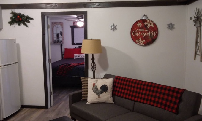 The Coop offers a nice front porch to enjoy our peaceful country setting. This cabin can accommodate up to four guests with a Queen Size bed in the bedroom and Futon that makes a full size bed in the living area. You’ll find the well equipped kitchenette perfect for meals with a 2 burner cooktop, full size refrigerator, microwave, toaster, coffee maker and dishware. The bathroom offers a tub/shower combo.