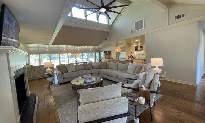 As you step inside, you’ll be greeted by a spacious and beautifully designed interior. The large living area is perfect spot to unwind after a day on the lake or golf course. The open concept layout flows seamlessly into the dining area, where you can enjoy meals with a view of the lush fairways.