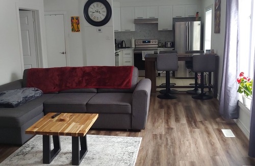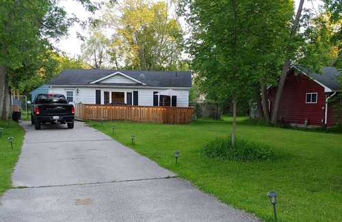 This newly renovated warm and lovely 2 bedroom with 1 washroom cottage has been recently renovated and updated. This place offers couples and/or families with children: large windows throughout, new pot lights (dimmable) open concept kitchen and living room, newly renovated washroom and bedrooms. Also recently added is a 75 inch Smart TV to watch movies or for gaming. Also included is high speed internet and Netflix and other apps on the TV. Tastefully decorated to make you feel at home away from home. Furnished with new beds, new sectional sofa bed couch, new stainless steel kitchen appliances, new electric fireplace and new kitchenware with access to new cutlery and plates, glasses and wine glasses as well with a new dishwasher. Parking for 4-5 cars approx.