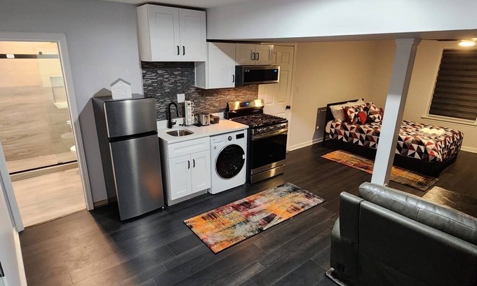 650 sqf with kitchen , washer/dryer , modern bathroom, tv , recliner, grill , patio table and chairs. Very quite safe and modern area. 2 mins to i400 highway. 8 mins to North Pointe Mall and 10 mins to Avalon.