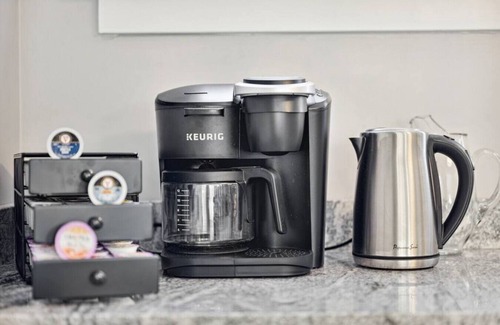 The kitchen has a full-size refrigerator/freezer, oven, stove, dishwasher and microwave. All pots, pans and cooking utensils are provided. There's also a single brew keurig/coffee maker with coffee, decaf and tea pods.