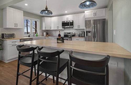 Two full contemporary bathrooms on the second floor and one half-bath on the first floor allow guests to spread out and enjoy their own space. The master bathroom offers a tub and shower combo, while the second full bathroom offers a tiled walk-in shower. Each bathroom is appointed with a hair dryer, paper products, and hand soap, but be sure to bring your own toiletries, including shampoo, conditioner, and body wash. 🚿🛁🧴