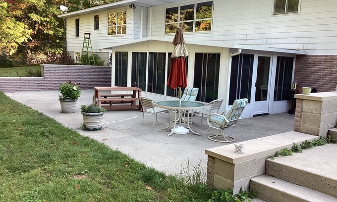 A large ranch home with space enough for large family gatherings. Renovations completed in 2023 with all new appliances, updated floor and wall covering and additional bedrooms. A complete kitchen upstairs and down. Bedrooms upstairs and down as well as TV room and game room with pool table and dart boards, downstairs. A large dining area attached to an open kitchen. Large living room with 85 inch TV streaming content. Downstairs also has attached screened in room with large cement patio facing the Thunderbay River. Ample yard for children and dogs to romp. Also there is a fenced in yard attached to the patio with screened in porch in case you would like a child or dog contained. Ample walking trails extend from the yard and continue to the state park 11/2 miles down the trail and thousands of acres of state land used for snowmobiles, walking and equestrians in the Mackinaw State Forest. A private getaway but just 1o minutes from a major grocery store and 15 minutes to beautiful, Lake Huron Beaches. Alpena is a quiet, pleasant, mid-size northern Michigan town. You get northern Michigan bliss without Traverse City crowds.