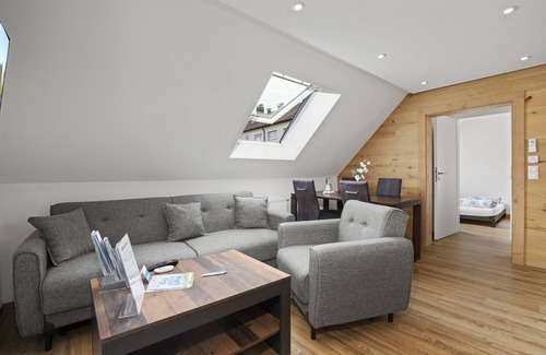 Located in Friedrichshafen, this welcoming condo lets you experience it all. There's convenient onsite parking, so you can leave your vehicle behind and let your feet make short work of the 11-minute walk to Friedrichshafen Promenade or the 10-minute walk to Graf-Zeppelin-Haus. If you're looking to expand your horizons and see other nearby locales, you can catch a train at either a short Friedrichshafen City Station, 11-minute walk away, or Friedrichshafen Landratsamt Station, 13 minutes away.