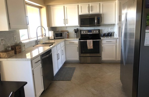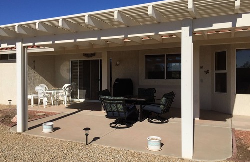 Spend your vacation in this newly renovated home in Sun City West, a planned active adult premier golf community. This beautiful home has been completely renovated in 2015 with porcelain tile throughout including two bathroom showers. The kitchen has granite countertops, smooth top electric range, microwave, dishwasher, and side by side refrigerator. There is an eating area in the kitchen that seats 4. All cooking utensils and dishes included. Guests provide their own meals. Living room has leather couch and love seat, 60 inch television with stereo. The master bedroom has a king size bed and an attached bathroom with granite countertops.. Cable television in master bedroom. The guest room includes a queen bed and large closet. Linens and towels are provided. The living room has a vaulted ceiling and new leather couches with a door wall leading out to the patio. Cable television and WiFi included. The dining area can seat up to 8 guests. Washer/dryer is located off the kitchen area. The home includes an attached garage and two bicycles for your enjoyment. The backyard patio (with pavers) has a Weber barbecue and patio table with a propane fire pit. Also has a matching bistro chair set for your morning coffee pleasure.
