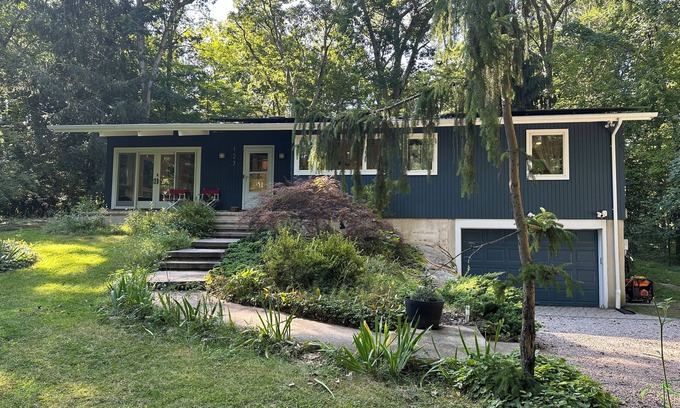 Our spacious, family-friendly ranch home features a bright living room with expansive windows looking onto the surrounding 1.5-acre woods. Vaulted ceiling, wood paneling, and a cozy fireplace complete the peaceful gathering space. Rustic flagstone floors invite you into an open dining room and newly renovated kitchen, while modern appliances—including brand new light fixtures and Frigidaire induction stove—make dining-in a pleasure. Three bedrooms, a den/office (with a pull-out couch), laundry room, sunroom with skylights, and a private master bathroom make space for multiple guests. Enjoy an additional guest bathroom complete with Japanese soaking tub, rain shower, and heated towel rack. The house has been newly upgraded with central air-conditioning, fans in all the bedrooms, on-demand hot water, all new windows and doors, and solar panels. Also, a 40A Level-2 EV charger is available for an additional fee.