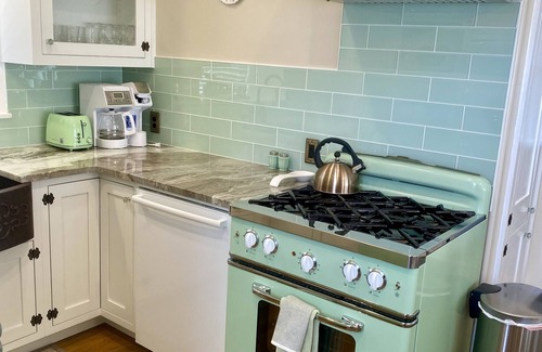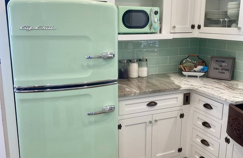 Who doesn't love a retro (but brand new) fridge and stove? Cook anything you like or go out to dinner. It's easy with choices all around. Fresh eggs, jam, fruits, and nuts are for your enjoyment when available from our hobby farm.