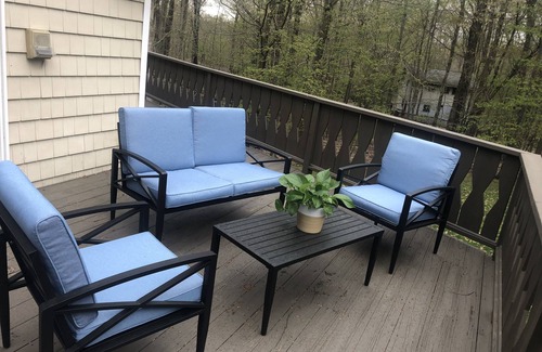 We are in the highest point of the Poconos so it typically stays cool in the house at night during warm weather months but we do have Mitsubishi split system ready for your air conditioned comfort and box fans in every bedroom. Outside, enjoy s'mores and relaxing by the fire pit, play a game of soccer, baseball or cornhole in the yard. We have 2 children's bicycles (two wheel; no training wheels), a Razor scooter, ladder ball, can jam and extra chairs for the fire pit or lake available for your use. We also have a charcoal grill, parking for up to 9 cars and wood for the fireplaces. You can also have an adventure and find your own sticks and wood for the fire pit in the wooded lot that’s yours for exploring. Thank you for booking!