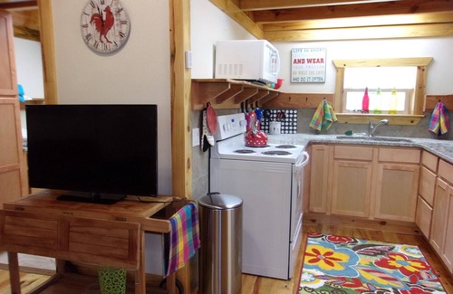 Small but mighty! This 450 square foot cottage with its heart pine vaulted ceiling and its 12 by 24 foot porch has a surprisingly spacious feel and is loaded with country charm. Located on the back of our five acre country property, the cottage offers a safe, quiet environment for your stay in Central Florida. The cities of Mount Dora and Eustis are both just five miles away with their quaint shopping areas and lakeside parks. Orlando with its theme parks, ocean beaches and the gulf coast are all easily accessed .