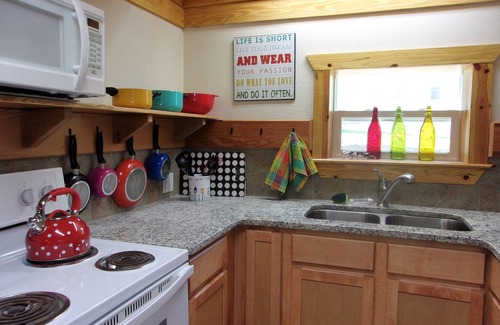 Originally built in 1941 for use as a milk barn, the cottage has recently been completely rebuilt and reinvented as a vacation rental. A great deal of thought and effort has gone into the design and use of the available space. The use of a drop leaf table and folding chairs for interior dining and a queen size Murphy bed for sleeping, gives the central living space and open, uncluttered feel. A comfortable couch, end tables,recliner, and entertainment center with flat screen tv complete the main living area. Bright colorful accessories and decor have been used through the cottage