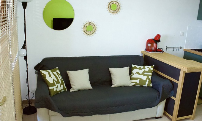 HostnFly offers you this charming 27 square meters studio cabin in Rayol-Canadel-sur-Mer, in a small, secure, quiet residence with trees and parking space. Sleeping 2 people, it's ideal for a couple. The apartment has a terrace overlooking the sea and the Golden Isles (Ile du Levant and Port Cros).