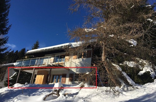 50 m2. More information by the provider: Lower apartment of a small two-family house, last house at the end of a private road, very quiet with a wonderful view to the valley, not far from the slopes, surrounded by meadows and trees, large veranda. The apartment has two bedrooms, a bathroom with shower and washing machine, a new, modern kitchen with a large dining table, an iron stove for open fire, a living room with TV and internet.